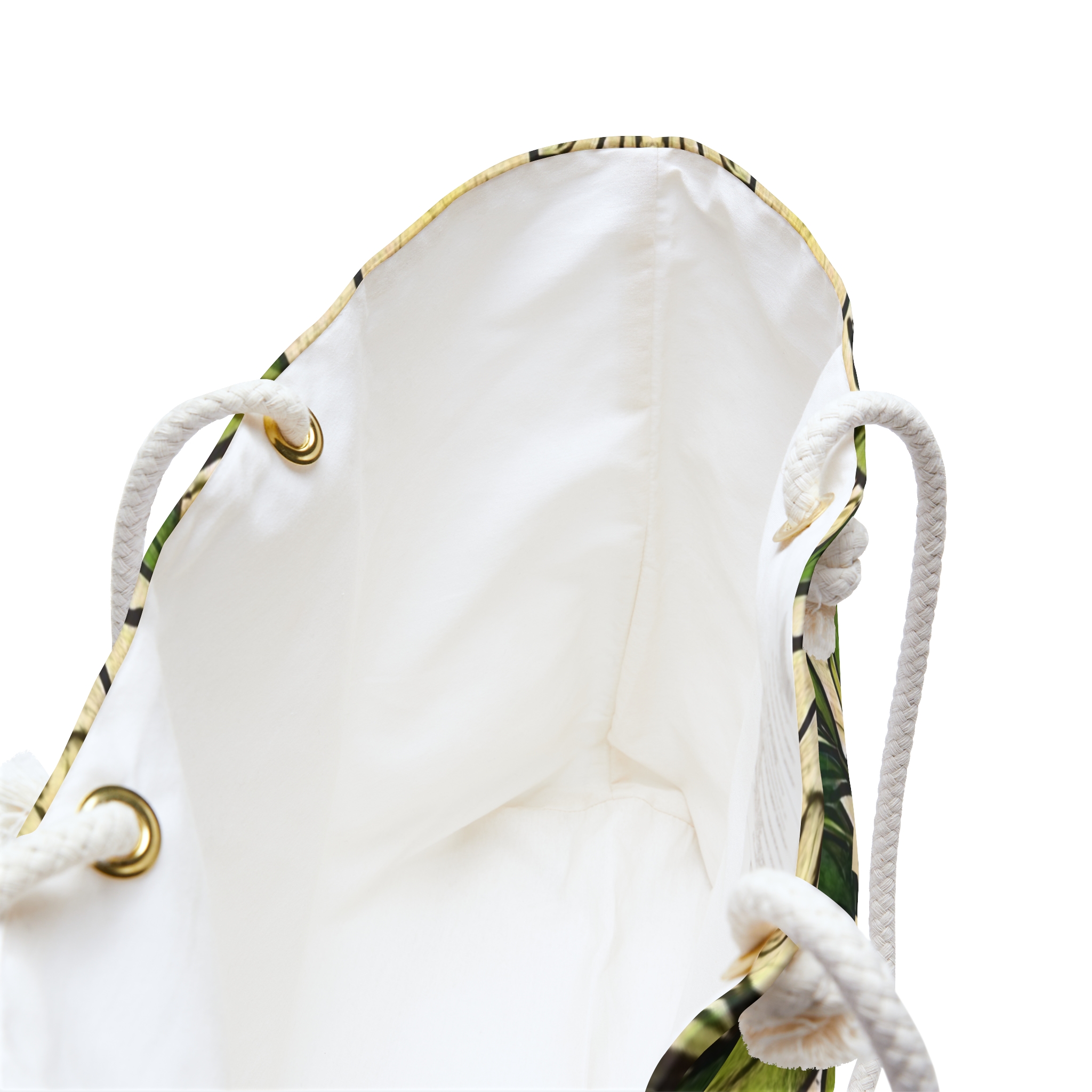 – 27″ cream cotton rope handles threaded through gold-color metal grommets for a nautical feel