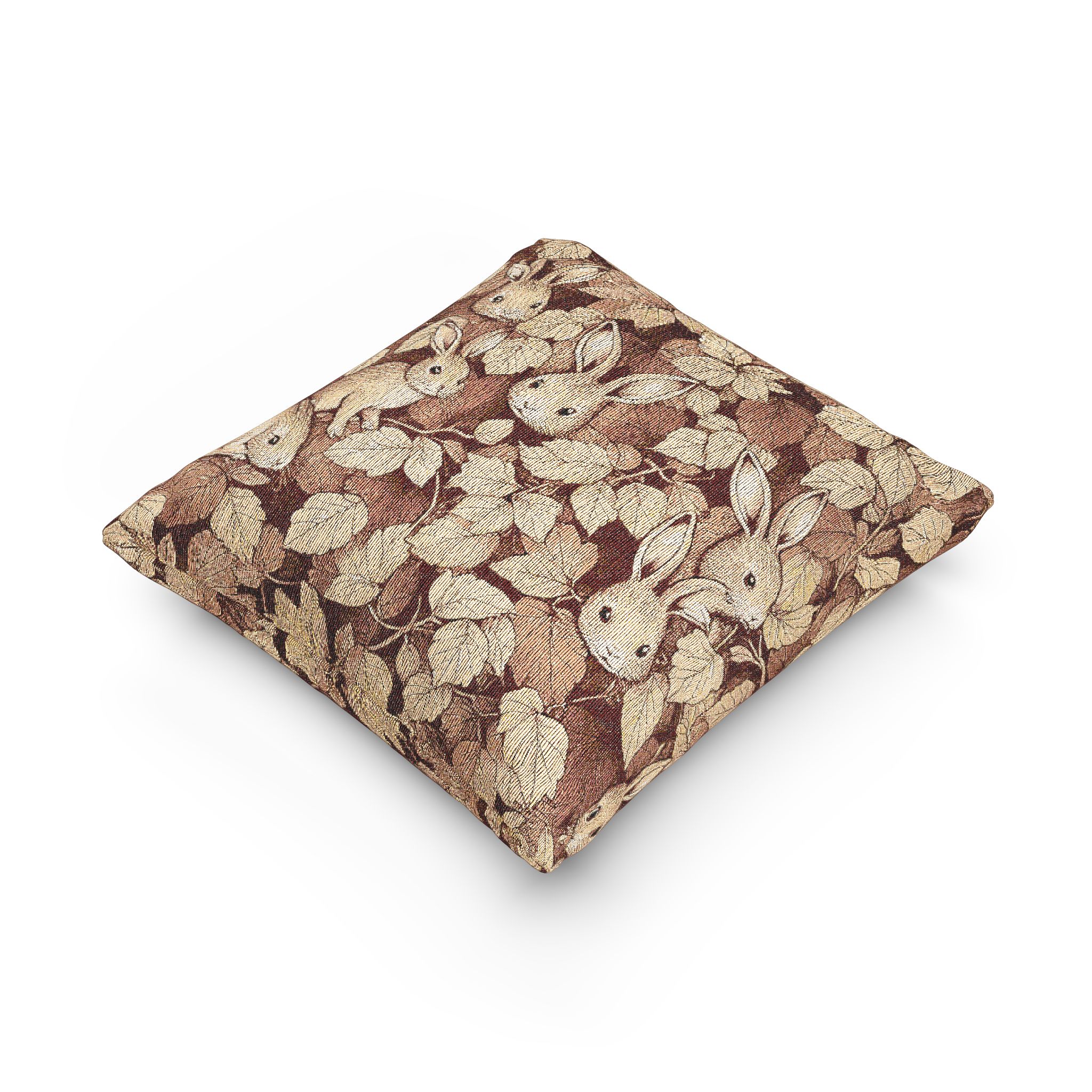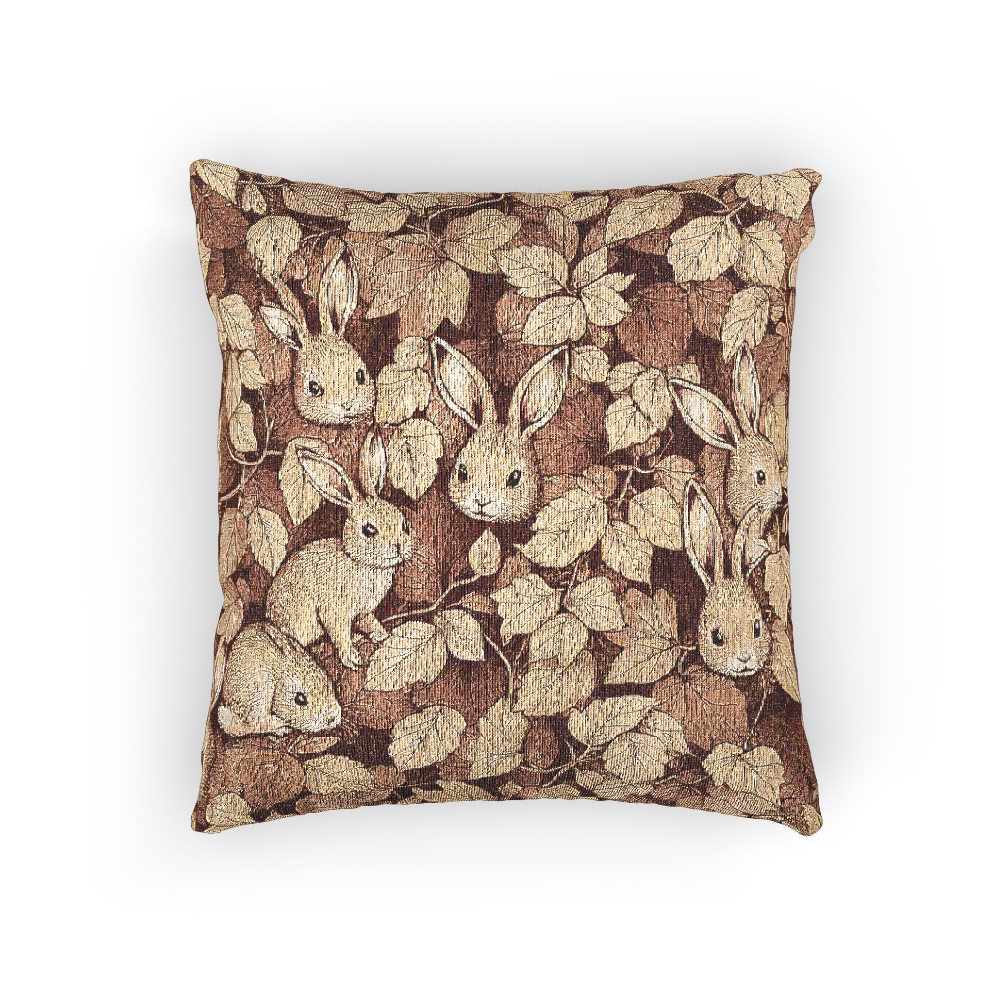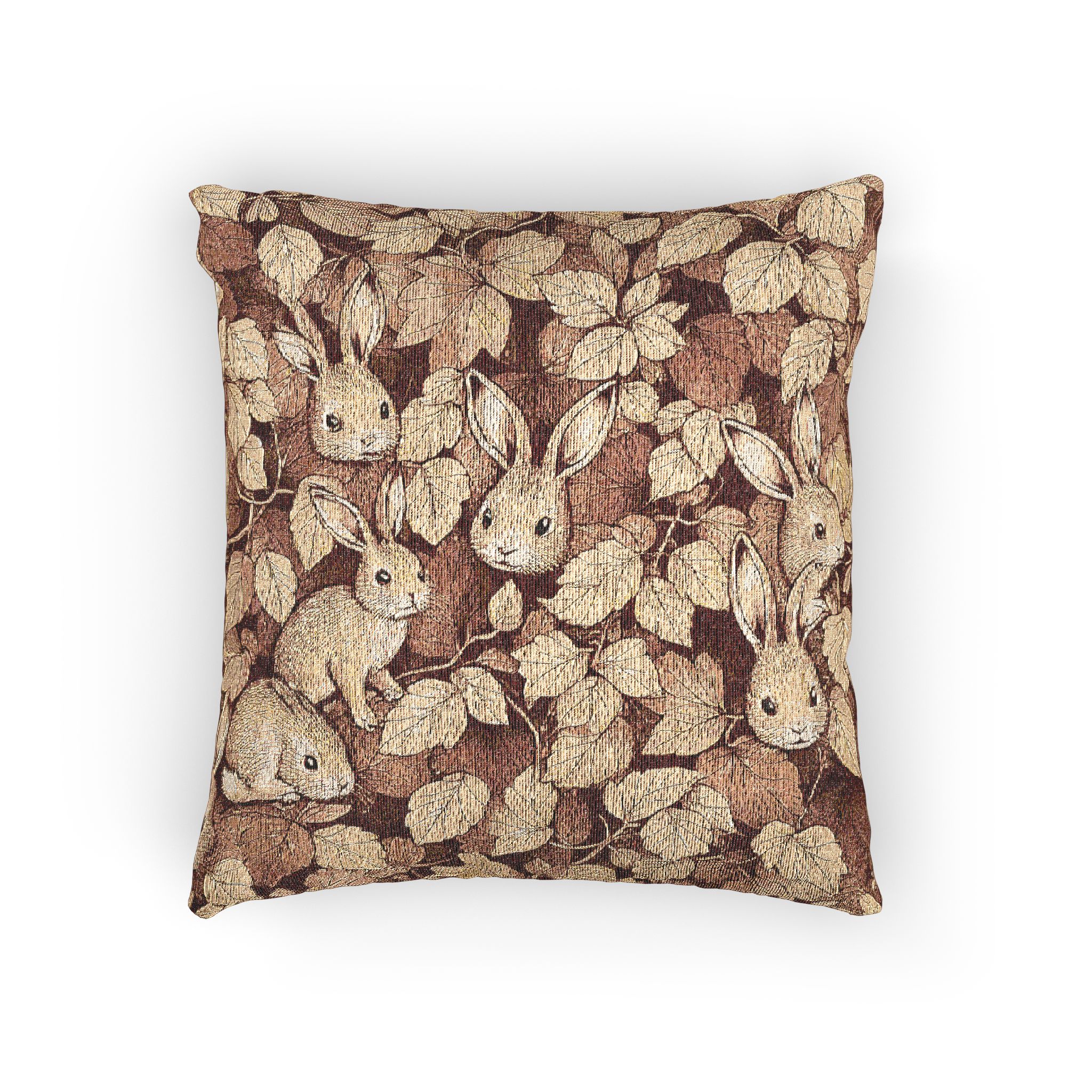 Rustic Bunny Woven Pillow. Transform your living space with this charming woven pillow, perfect for adding a touch of warmth and coziness to any room. The intricate design, featuring playful rabbits against a backdrop of lush leaves, brings a whimsical vibe that invites comfort. Ideal for those who cherish nature-inspired decor, this pillow suits both adults and families, making it a delightful addition to your home. Note: the image may not fully represent the final weave and color transitions.