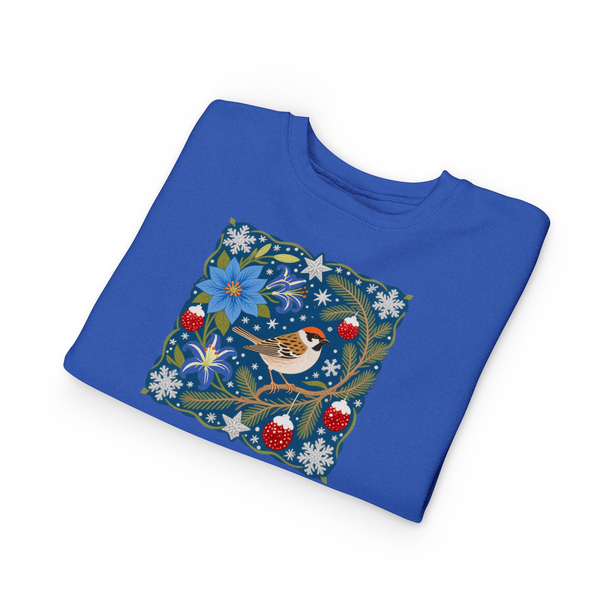 Toddler Sweatshirt — Festive Winter Bird Floral Design. A soft, cozy toddler sweatshirt that brings a little winter wonder to their day. The front features a hand-drawn square illustration: a delicate bird perched among frosty blue flowers, lilies, red berries, and gentle snowflakes. The muted, speckled fabric gives a homespun, cottage feel that complements the folk-art style of the print. Lightweight but warm, it layers easily over shirts for playground runs, family outings, or quiet mornings at home. The tear-away label keeps little necks comfortable, and the ribbed cuffs and waistband help hold warmth without restricting movement. This kids bird sweatshirt settles into everyday life — snuggly, cheerful, and quietly festive.